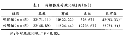 結(jié)果見(jiàn)表1和表2。治療過(guò)程中,對(duì)照組出現(xiàn)皮疹1例,腹瀉2例,頭痛1例,不良反應(yīng)發(fā)生率為8.89%;觀察組出現(xiàn)惡心嘔吐2例,腹瀉1例,腹痛2例,頭痛1例,不良反應(yīng)發(fā)生率為 13.33%。以上不良反應(yīng)均輕微,不影響治療。兩組不良反應(yīng)發(fā)生率比較,差異無(wú)統(tǒng)計(jì)學(xué)意義(p > 0.05 )。