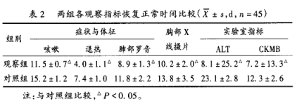 兩組患兒均給予吸氧、止咳、化痰、平喘、保肝、護(hù)心等常規(guī)治療,合并胸腔積液者行胸腔閉式引流,合并肺不張者行纖維支氣管鏡支氣管灌洗。對(duì)照組給予阿奇霉素注射液(石藥集團(tuán)歐意藥業(yè)有限公司,批號(hào)為082H0302)10mg/(kg?d)靜脈滴注,每日1 次,連用5d停3d為1個(gè)療程;病情平穩(wěn)后改為口服阿奇霉素 10mg/(kg?d) ,每日1次,連服3d停4d為1個(gè)療程。觀察組在對(duì)照組治療方法的基礎(chǔ)上加用克拉霉素分散片(揚(yáng)子江藥業(yè)集團(tuán)有限公司,批號(hào)為09072701)15mg/(kg?d)口服,每日2次,連用5 d停2 d為1個(gè)療程。住院期間由專(zhuān)人觀察并記錄患者癥狀、體征變化及藥品不良反應(yīng),行血常規(guī)、尿常規(guī)、肝腎功能和胸部x 線攝片檢查,記錄兩組患兒退熱時(shí)間、咳嗽及肺部羅音消失時(shí)間,丙氨酸轉(zhuǎn)氨基轉(zhuǎn)移酶(ALT)及肌酸激酶同工酶(CKMB)恢復(fù)正常時(shí)間,胸部x線攝片恢復(fù)正常時(shí)間(病灶部分或完全吸收時(shí)間)。