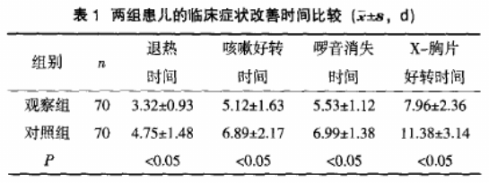 1.1一般資料選取2012年6月至2016年12月期間我院收治的140例小兒支原體肺炎患兒。納人標(biāo)準(zhǔn):①經(jīng)實(shí)驗(yàn)室檢查及輔助檢查后,確診為小兒支原體肺炎;②對治療藥物無過敏反應(yīng);③患兒無嚴(yán)重并發(fā)癥。排除標(biāo)準(zhǔn):①臨床資料不完整;②未按要求接受規(guī)范化治療;③患兒參與研究前接受其他相關(guān)藥物治療。將140例患兒隨機(jī)分為觀察組和對照組各70例。觀察組患兒中男39例,女31例;年齡3-7歲,平均年齡(5.31 ± 1.97)歲;伴明顯咳嗽67例,伴頭痛、咽痛47例,伴厭食、精神不振44例,白細(xì)胞水平異常40例,血沉異常37例。對照組患兒中男33例,女37例;年齡2-7歲,平均年齡(5.53 ± 1.77)歲;伴明顯咳嗽73例,伴頭痛、咽痛52例,伴厭食、精神不振49例,白細(xì)胞水平異常36例,血沉異常35例。兩組患兒的一般資料比較,差異無統(tǒng)計學(xué)意義(P>0.05)。