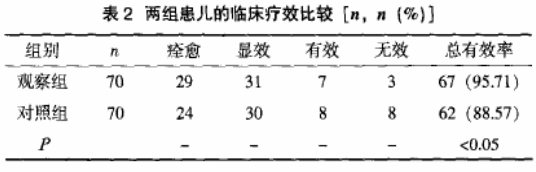 2.2 兩組患兒的臨床疔效比較 觀察組患兒的治療總有效率為95.71%,顯著高于對照組患兒的88.57%(P<0. 05)。見表2